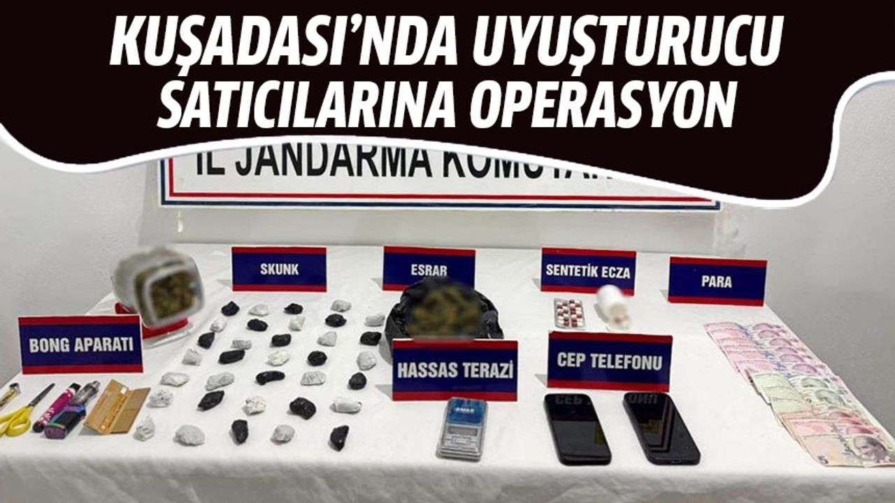 Aydın İl Jandarma Komutanlığı tarafından yasaklı madde imal ve ticareti ile mücadele kapsamında, Güzelçamlı Mahallesi’nde, Narkotik Suçlarla Mücadele Şube Müdürlüğü koordinesinde ve Kuşadası İlçe Jandarma Komutanlığı ekiplerince yürütülen müşterek çalışmada sokak satıcılarına yönelik bir operasyon düzenlendi. Operasyon kapsamında F.Ş. (20) ve S.Ç. (21) isimli şahısların üzerlerinde ve adreslerinde yapılan aramalarda 400 gram esrar, satışa hazır halde paketlenmiş 34 adet yasaklı madde, 17 adet uyuşturucu hap, 1 adet bong aparatı, 1 adet hassas terazi, 2 adet cep telefonu, 1495 TL nakit para ele geçirildi. Gözaltına alınan iki şüpheli hakkında adli işlem başlatılırken, şahıslar gerekli işlemlerin ardından adliyeye sevk edildi.