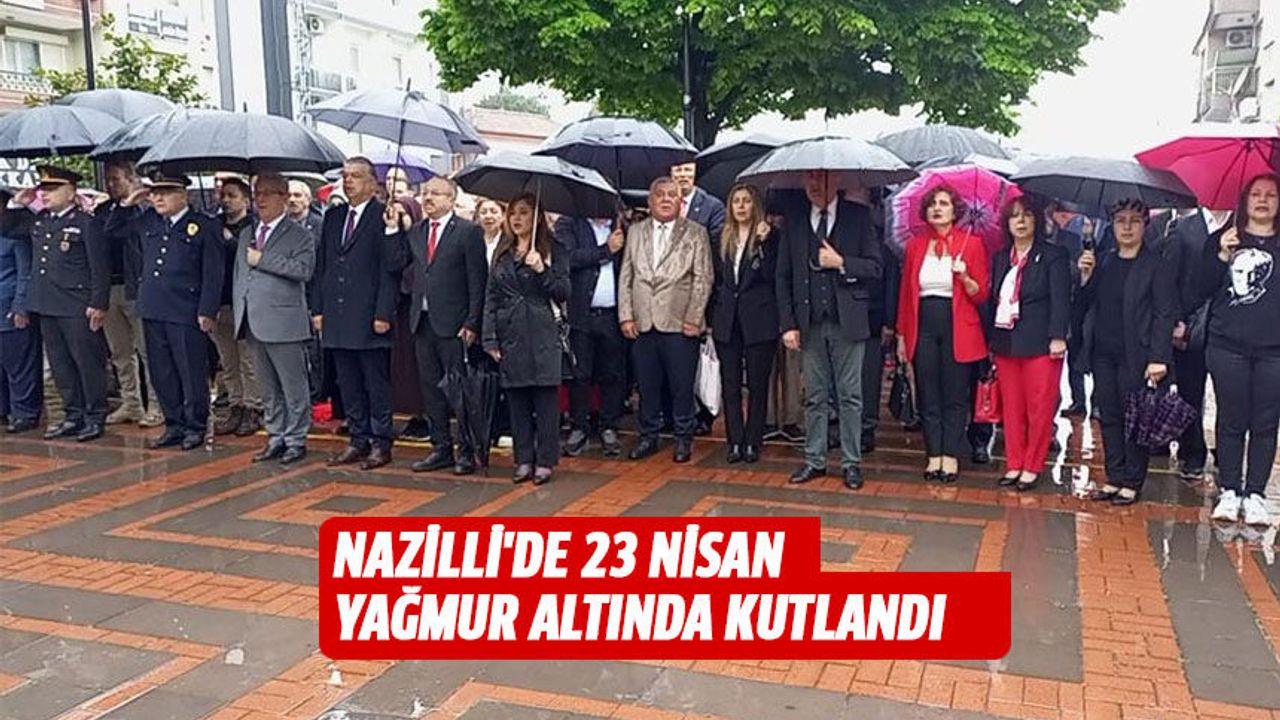 Gazi Mustafa Kemal Atatürk’ün tüm dünya çocuklarına armağan ettiği 23 Nisan Ulusal Egemenlik ve Çocuk Bayramı Nazilli İstasyon Meydanı’nda çelenk koyma töreni ile başladı. Sağnak yağış altında yapılan törene Nazilli Belediye Başkanı Ertuğrul Tetik, İlçe Emniyet Müdürü Erdal Esen, İlçe Milli Eğitim Müdürü Erdinç Güner, siyasi parti temsilcileri, daire müdürleri, Türkiye Gaziler Derneği Başkanı Hasan Karataş, STK temsilcileri, öğretmenler, öğrenciler ve vatandaşlar katıldı. Tören İlçe Milli Eğitim Müdürlüğü’nün çelenginin müdür Erdinç Güner tarafından Atatürk Büstü’ne konmasıyla başladı. Ardından saygı duruşu ve İstiklal Marşı’nın okunmasıyla devam etti. Daha sonra Nazilli İlçe Milli Eğitim Müdürü Erdinç Güner günün anlam ve önemini anlatan bir konuşma yaptı. Konuşmanın ardından tören sona erdi.