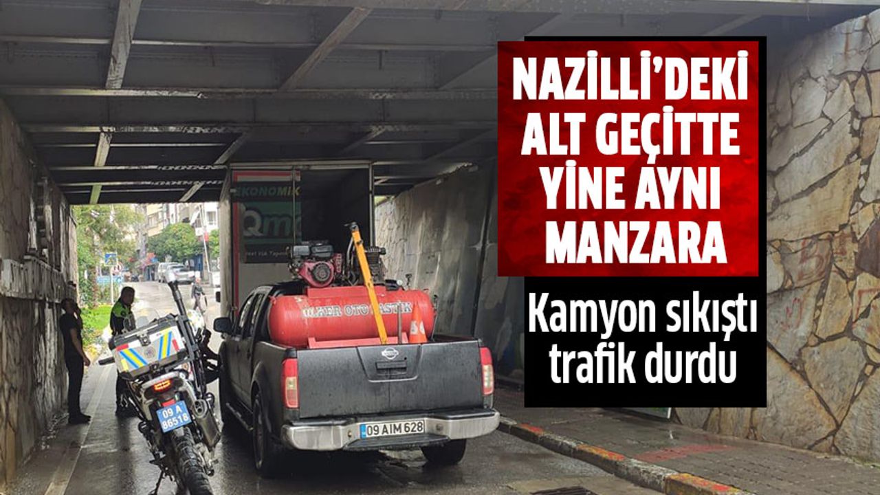Nazilli’de sık sık benzer olaylarla gündeme gelen İstasyon Meydanı alt geçidinde bir kamyon daha sıkıştı. Sabah saatlerinde 42 APU 856 plakalı kamyonun sürücüsü, geçitteki yükseklik sınırını hesaba katmadan alt geçide girmeye çalıştı. Yüksekliği uygun olmayan araç ilerleyemeyince geçitte mahsur kaldı.