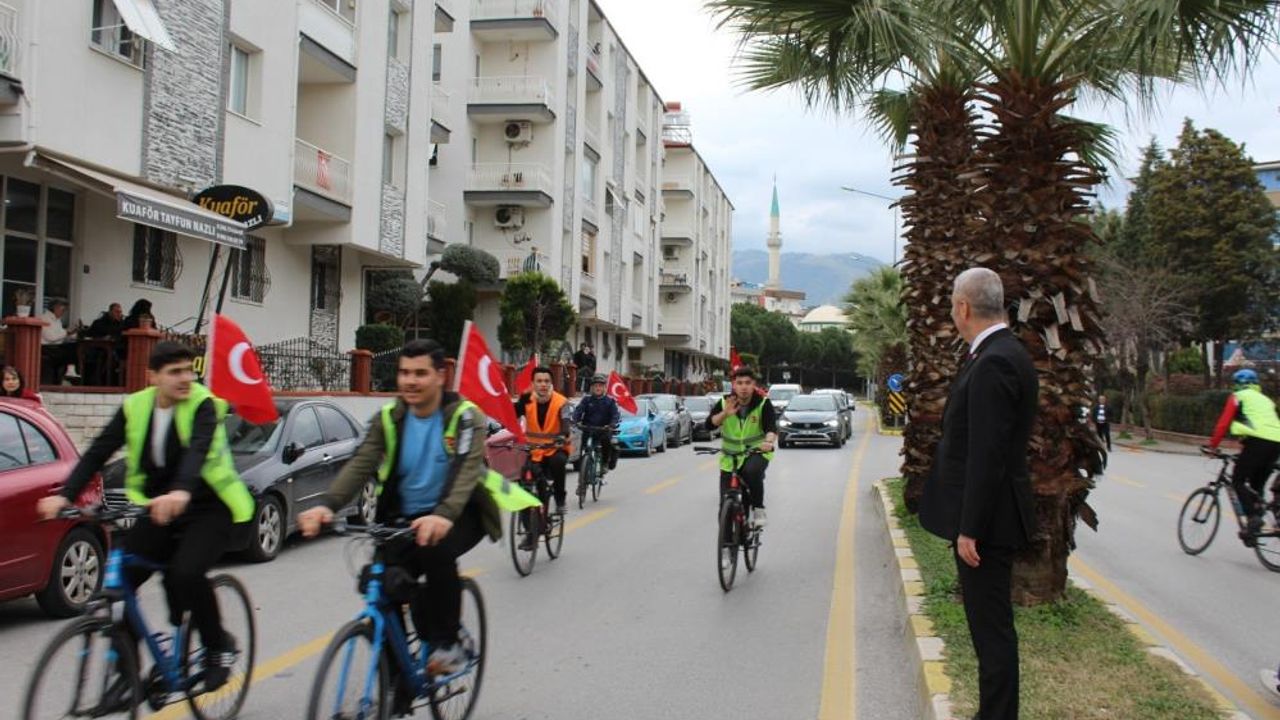 Aydın'ın Efeler ilçesinde "İstiklal Bayrakla, İstikbal Maarifle" temasıyla düzenlenen bisiklet sürüş etkinliğinde öğrenciler, Türk bayrağının manevi değerine dikkat çekmek için pedal çevirdi.