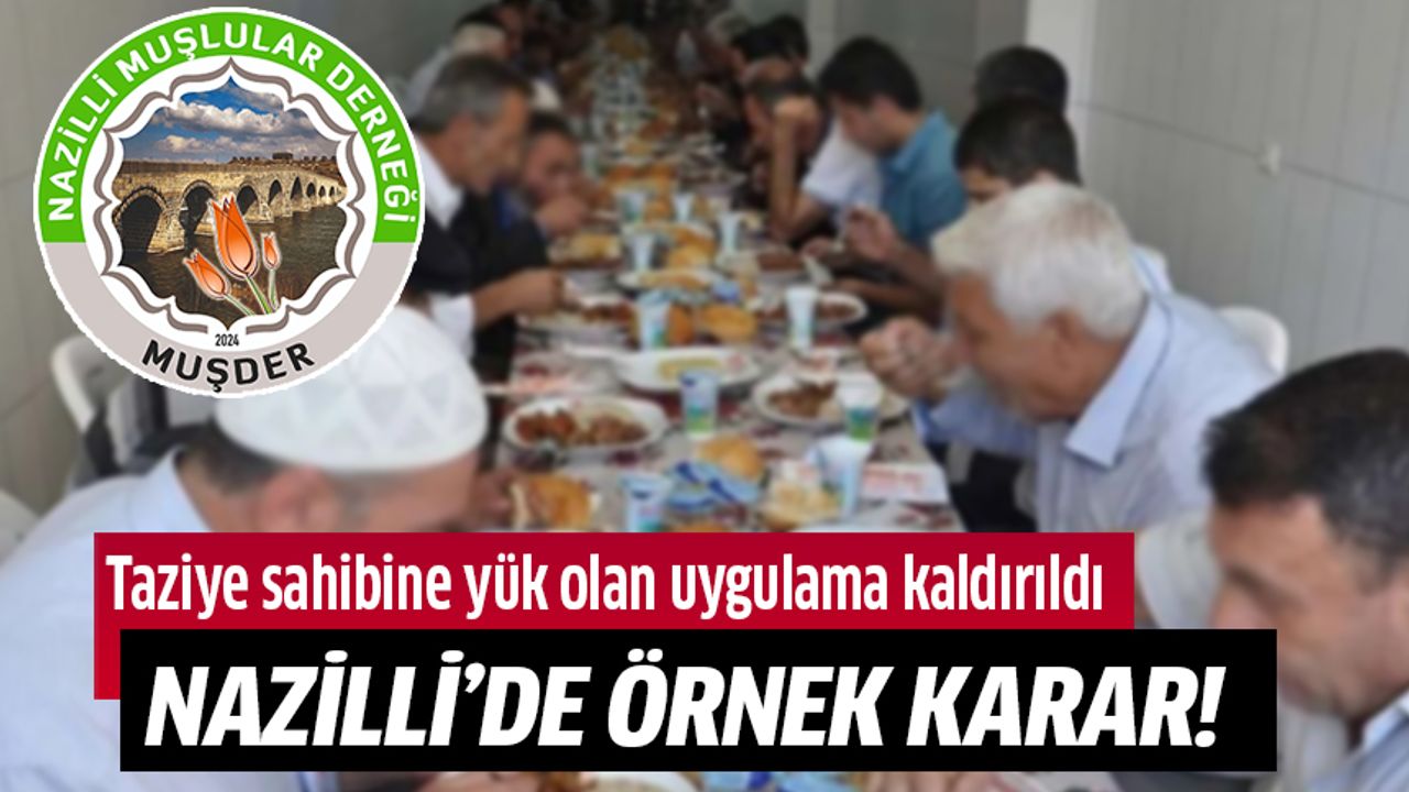 “Taziye yemeği Peygamberimiz (S.A.V.) sünnetine aykırıdır. Bundan dolayı taziye evlerimizde taziye yemeği verilmesi, Nazilli Muşlular Derneği yönetim kurulunun aldığı karar ile kaldırılmıştır.”