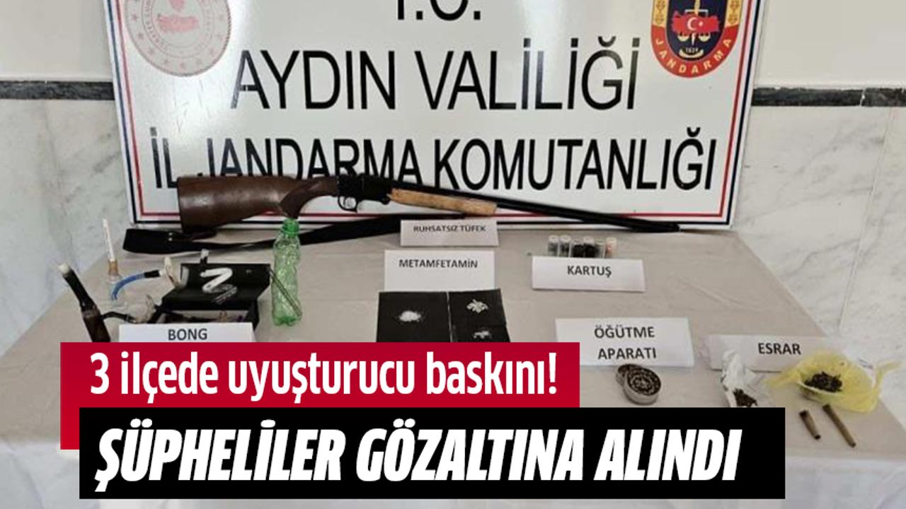 Aydın genelinde uyuşturucu ile mücadele kapsamında yürütülen çalışmalar aralıksız devam ediyor. Edinilen bilgiye göre jandarma ekipleri Kuyucak, Nazilli ve Buharkent ilçelerinde belirlenen adreslere eş zamanlı operasyon düzenlendi. Yapılan aramalarda metamfetamin, sentetik hap, kubar esrar, uyuşturucu kullanma aparatları ve 1 adet ruhsatsız av tüfeği ele geçirildi. Şüpheliler G.K., Y.G. ve T.Ç. gözaltına alınırken, ruhsatsız silah bulunduran bir şüpheliye de idari para cezası uygulandı. Gözaltına alınan 3 şüpheli hakkında adli işlem başlatıldı.